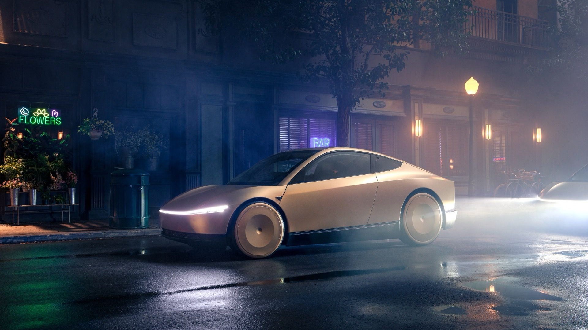 • 잠재력: 성공 시 매출 폭발 — 차 한 대가 24시간 돈 벌어줌 Cybercab 실물 — 핸들 없고, 문 위로 열리는 미래형 디자인 밤 거리에서 빛나는 Cybercab