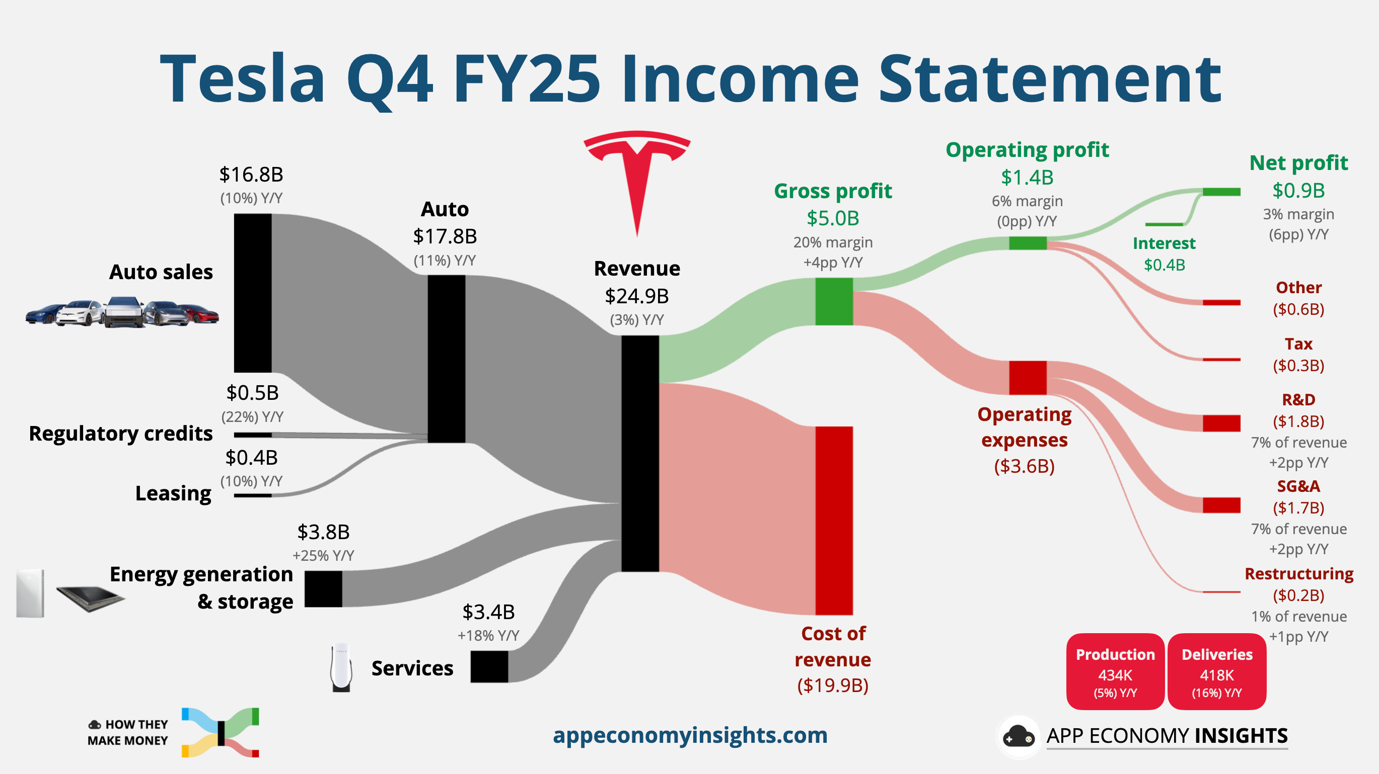 • 현금 흐름: 여전히 튼튼 (Operating Cash Flow 147억 달러, Free Cash Flow 플러스) 2025년 매출 흐름 Sankey 다이어그램 — 자동차는 여전히 주력, 에너지가 급성장 중 분기별 차량 인도량 — 2025년 Q4 41.8만 대, 피크 대비 감소